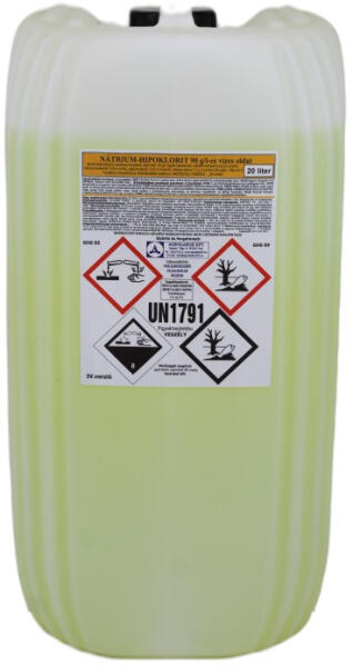 HYPO IPARI NÁTRIUM HYPOKLORIT 90 G/LITER 20 LITER Hypo ipari Nátrium hypoklorit 90 g/liter 20 liter GHS piktogram: Figyelmeztetés: Veszély Figyelmeztető mondatok: H290 Fémekre korrozív hatású lehet. H314 Súlyos égési sérülést és szemkárosodást okoz. H410 Nagyon mérgező a vízi élővilágra, hosszan tartó károsodást okoz. A Nátrium-hipoklorit 90 g/l-es oldatot alkalmazzák