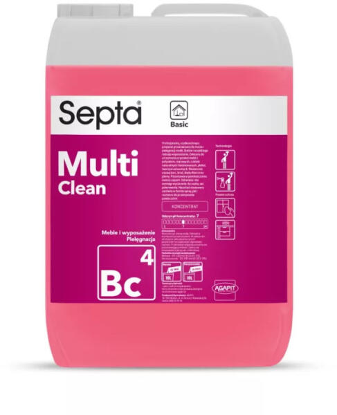 Bútor- és berendezésápoló folyadék. Kíméletes és hatékony. Használható spray-ként és felületmosó oldatként is. A Septa Multiclean BC4 professzionális, gyorsan száradó készítmény bútorok, munkalapok és mindenféle berendezés tisztítására és karbantartására. Ajánlott fényes, matt bútorok, természetes és laminált furnérok, plexi, műanyagok tisztaságának megő