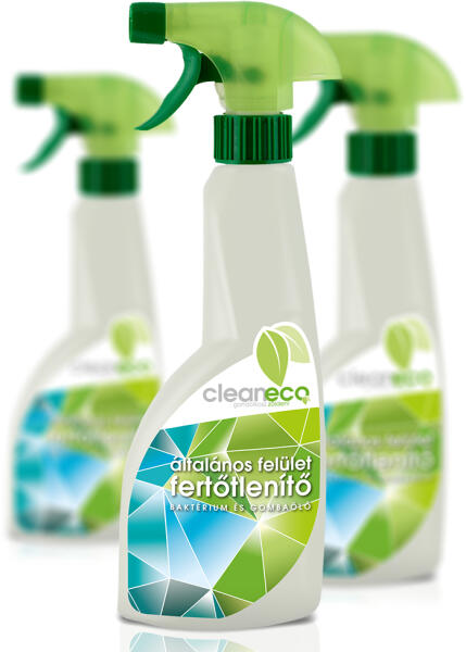 A Cleaneco általános felületfertőtlenítő egy klórmentes, 90%-ban növényi alapanyagokból készült magyar termék. Hipoallergén és állatkísérletmentes. A fertőtlenítő folyadék újrahasznosított csomagolásban kapható, ezzel is csökkentve a takarítás ökolábnyomát. Bármilyen vízálló felület fertőtlenítésére alkalmas.