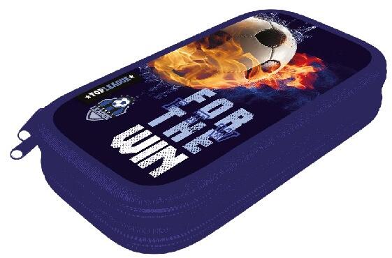 Focilabdás mintájú 2 emeletes tolltartó fiúknak. Kialakítása: egyik szintjén 9+9 gumipánt található ceruzák számára, a másik szinten 6 gumipánt írószereknek, 1-1 gumipánt radírnak, hegyezőnek és vonalzónak, valamint átlátszó órarendtartó zseb. Összesen 21+4 gumipánt írószerek és egyéb kiegészítők számára. Mérete: 22x4x13 cm. Színe: sötétkék. Minőségi L
