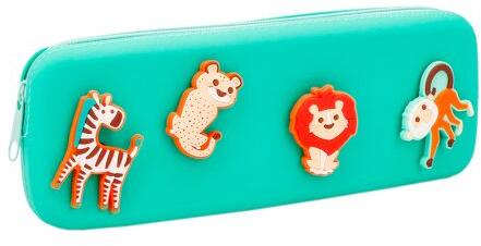 Kisebb írószer tok 1 cipzárral a kicsiknek. tetején forgó, gumiállatokkal könnyen mosható anyag (szilikon) gyerek hátizsáknak megfelelő méret