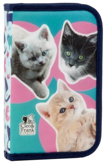 A Cleo és Frank cicás kihajtható tolltartó elején édes kiscicák képe látható. A tolltartó belsejében két kihajtható fül található, ezeken lehet a sok-sok ceruzát, filctollat, radírt a gumis fülecskék segítségével elrendezni. Minden szükséges iskolai eszköznek megtalálod benne a helyét. Hozzá illő cicás iskolatáskával és tornazsákkal összeállíthatod egyedi isk