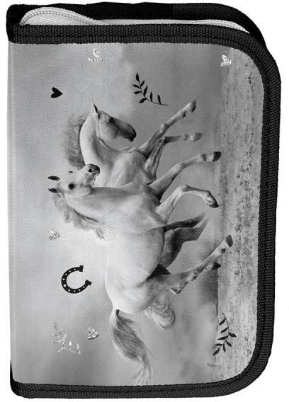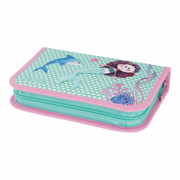 31 részes tolltartó 20,3x14x3,5 cm-es méretben, fedelén flitteres díszítéssel, 2 klapnis. Tartalma: 14 db filctoll, 1 db golyóstoll, 1 db radír, 1 db ceruzahegyező, 2 db grafitceruza, 8 db színesceruza, 1 db egyenes vonalzó, 1 db háromszög vonalzó, 1 db órarend, 1 db tolltartó. Anyaga: poliészter. 31 részes tolltartó 20,3x14x3,5 cm-es méretben, fedelén flitteres díszítésse