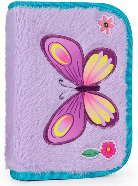Lepkés tolltartó klapnis, üres, plüss, rózsaszín. Méret: 210x145x50mm. Üres tolltartó.