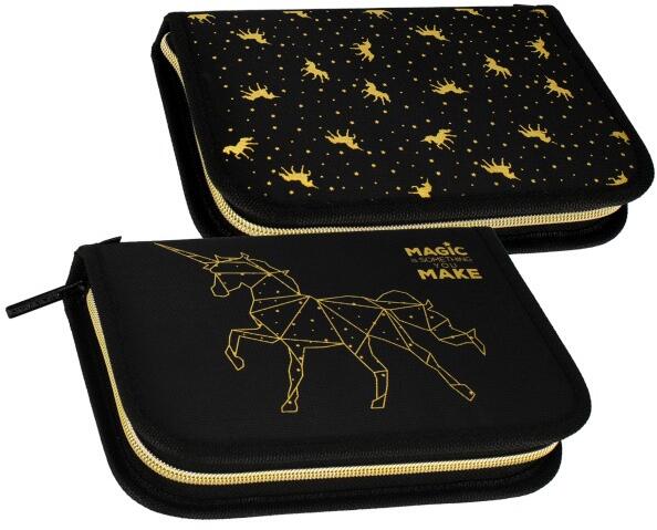Starpak unikornisos kihajtható felszerelt tolltartó - Gold Unicorn A fekete tolltartó anyagát látványos, arany színű unikornis minta és a csillagos eget idéző fényes pontok díszítik. A tolltartóban minden írószer benne van, amire csak szüksége lehet egy kisiskolásnak. A tolltartó belsejében gumipántokkal vannak rögzítve az irodaszerek. A 18 darab írószer mellett helyet k