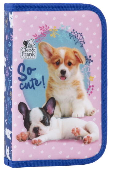 A Cleo és Frank kutyás kihajtható tolltartó elején cukik kutyusok képe látható. A tolltartó belsejében két kihajtható fül található, ezeken lehet a sok-sok ceruzát, filctollat, radírt a gumis fülecskék segítségével elrendezni. Minden szükséges iskolai eszköznek megtalálod benne a helyét. Hozzá illő cicás iskolatáskával és tornazsákkal összeállíthatod egyedi isk