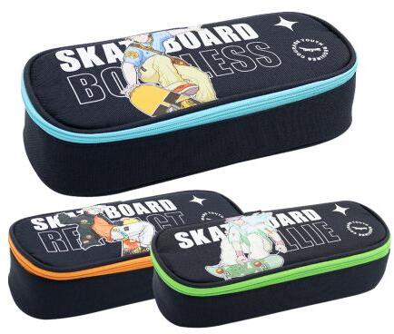 A textil borítású, 1 cipzáras tolltartóban minden írószer megbízhatóan tárolható (3 gördeszka kivitel). a felső fedél alatt széles hálós zseb található a belső szárny bevarrt gumiszalagokat tartalmaz 5 írószer tárolására nagy hely a tolltartó alsó részében a bő tanszerek számára válasszon színváltozatot az árcédula feletti mezőben (a cipzár színe szerint) A