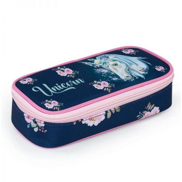 Csodálatos unikornis mintájú szögletes cipzáras tolltartó belső cipzáras és nyitott zsebbel, középen füllel, melynek mindkét oldalán gumipántok találhatóak. A mélyített belső részbe ömleszthetőek az írószerek. Mérete: 20,5x5x10 cm. Anyag: poliészter. Szín: sötétkék/rózsaszín.