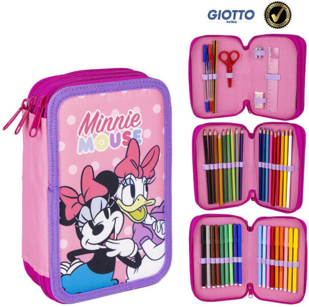 Disney Minnie, Daisy tolltartó töltött 3 emeletes Tartalma: - 18 db színes ceruza - 18 db színes filctoll - 1 db grafit ceruza - 1 db hegyező - 1 db radír - 1 db kék toll - 1 db piros toll - 2 db vonalzó Méret: 13x20x7 cm Kiváló minőségű olasz GIOTTO ceruzákkal és filctollakkal töltött tolltartó!