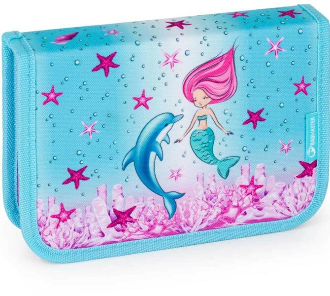 Kedves sellő motívummal ellátott iskolai tolltartó, üres, két kihajtható, gumis kialakítású füllel az írószerek, vonalzók és radír tárolásához. Belseje mintás anyaggal borított. Átlátszó fólia alatt van egy órarend. Méret: 20,5 x 13,5 x 4 cm Gyártó: Bagmaster