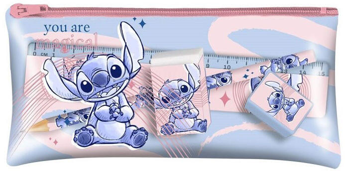 Disney Lilo és Stitch, A csillagkutya írószer szett Méret: 9,5x19 cm Tartalma: - 1 db tolltartó - 1 db vonalzó - 1 db radír - 1 db faragó - 1 db ceruza