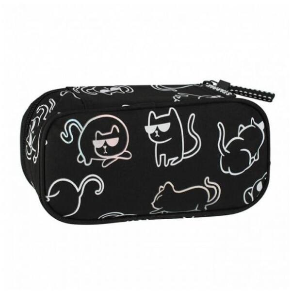 Mókás cicás grafikájú ovális cipzáras tolltartó belső cipzáras zsebbel, középen füllel, melynek mindkét oldalán gumipántok találhatóak. A mélyített belső részbe ömleszthetőek az írószerek. Mérete: 22x6x10 cm. Színe: fekete, fehér macskás grafikájú.