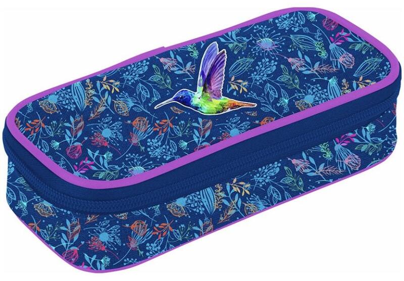 Iskolai tok/etue masszív cipzárral kolibri motívummal. Cipzáras zsebbel és mindkét oldalán rögzített hurkokkal ellátott füllel van felszerelve. A fedél alatt van egy hely az írószerek vagy más apró tárgyak ingyenes tárolására. Alkalmas iskolásoknak és idősebb diákoknak. Méretek: kb 21,5 x 10 x 5,5 cm