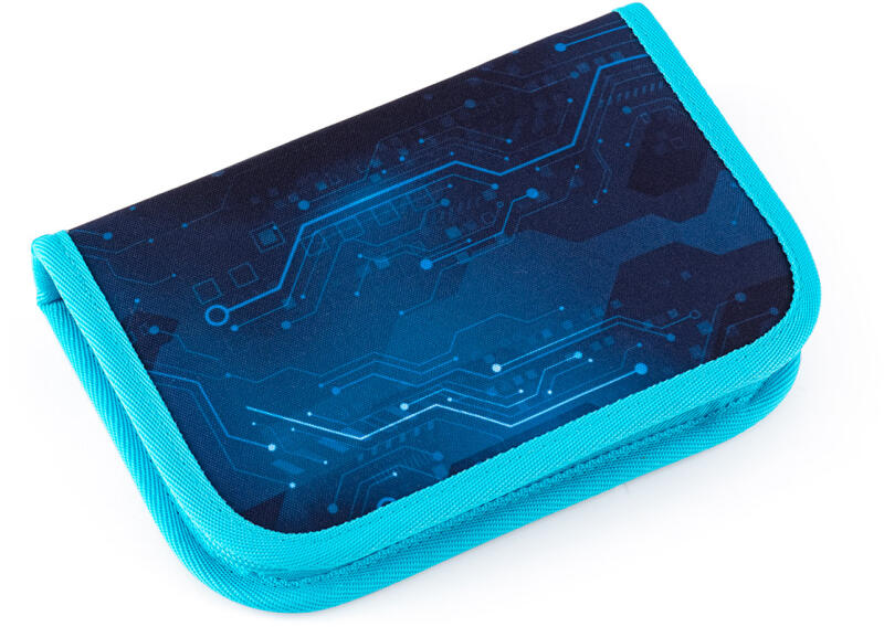 Egyrészes tolltartó fiúknak 23 különböző méretű gumiszalaggal a nagyobb ceruzák vagy tollak, vonalzó, hegyező és radír kényelmes tárolásához. A két belső szárny átlátszó zsebbel rendelkezik a külső oladlán, az órarend vagy egyéb apró dokumentumok számára. Belső oldalán egy kis zseb található, amely patenttal zárható. Újdonság : az egyrészes tolltartók cipz