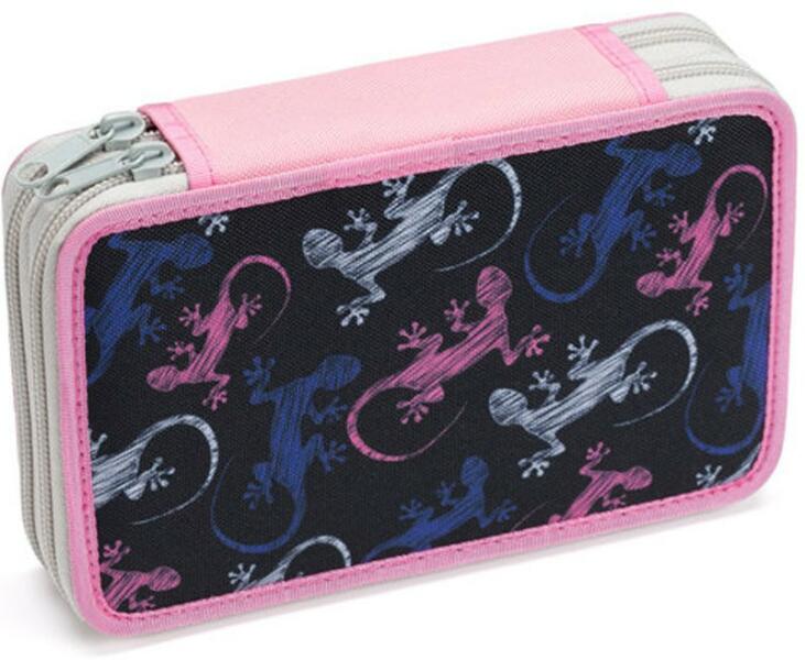 Emeletes tolltartó lányoknak, üres. Az első emeleten 10 gumihurkot tartalmaz zsírkrétához, ceruzához és három gumihurkot radír vagy hegyező tárolására. Egy zseb is található az apró tárgyak számára patentos zárással. A tolltartó második emeletén egy átlátszó zseb található az órarendnek és további 9 erős gumiszalag a különböző méretű íróeszközökhöz. A