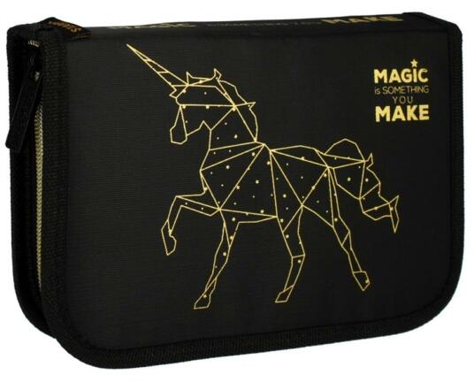 Az Unikornisos felszerelt tolltartó - Gold Unicorn teljes felszereltséggel kapható. A két, oldalra kihajtható fül rejti az 1 db grafit ceruzát , az 1 db golyós tollat , a 10 db színes ceruzát , a 12 db filctollat , radírt , hegyezőt és vonalzót . A tolltartót körben arany színű egyszarvúak díszítik.