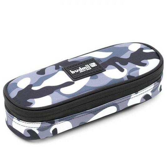 BUDMIL márkájú tolltartó nagyoknak szürke terepmintával. Az ovális formájú cipzáras tolltartó közepén van egy klapni, Egyik oldalán 4, másik oldalán 5 gumipánt található ceruzáknak, tollaknak. Az egyterű részébe bedobálhatóak az írószerek, kiegészítők. A fedelén belül egy cipzáras hálóz zseb is található. Mérete: 22,5x5x9 cm. Szín: szürke terepszínű, feket