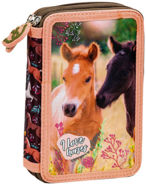 Lovas tolltartó, 2 emeletes, töltött, KO24, I love horses. Mérete: 21x12x4cm Súlya: 350g. Tartalmaz 18 db filctollat, 9 db színes ceruzát, egy tollat, egy grafit ceruzát, egy vonalzót, egy radírt és egy hegyezőt.