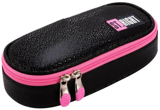 St. Right - Black Glitter ovális tolltartó (665387) belseje egyterű, praktikus cipzáras zseb is található benne, így elfér a tolltartóban az összes írószer, amire az iskolásoknak szüksége van. Ez a menő, pink glitterrel díszített tolltartó az iskolatáskák trendi kiegészítője lehet.