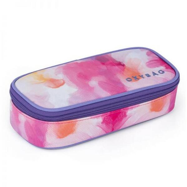 Oxy márkájú szögletes cipzáras tolltartó belső cipzáras és nyitott zsebbel, középen füllel, melynek mindkét oldalán gumipántok találhatóak. A mélyített belső részbe ömleszthetőek az írószerek. Lányos tolltartó mérete: 20,5x5x10 cm. Anyag: poliészter. Szín: rózsaszín folt mintás.