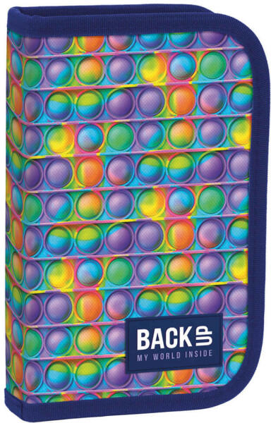 A BackUp felszerelt kihajtható tolltartó - Pop it teljes felszereltséggel kapható. A két oldalra kihajtható fül rejti a 10 db színes ceruzát, 7 db filctollat, 1 db golyóstollat, 1 db grafit ceruzát, radírt, vonalzót és hegyezőt. A kihajtható tolltartót a méltán népszerű játék mintázata díszíti.