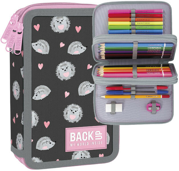 A BackUp Sünis felszerelt 3 emeletes tolltartó - Sündisznók (PB6EW16) teljes felszereltséggel kapható. A cuki süni mintával egyszerű és figyelemfelkeltő hatást nyújt, különlegesen kiemelik egyediségét a lila kiegészítők. Az iskolás fiúknak és lányoknak készült különleges tolltartó tartalma: 1 db golyóstoll, 1 db grafit ceruza, radír, hegyező, vonalzó, 9 db háromsz