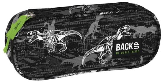 BackUp dinoszauruszos ovális tolltartó - Dinosaurs vagány dínós mintákkal díszítve. Egyterű belsejében praktikus felhajtható fül is található, melynek egyik oldalán kis cipzáras zseb van, másikon gumifülek tollnak, ceruzának. Az összes írószer elfér benne, amire az iskolában szükséged lehet.