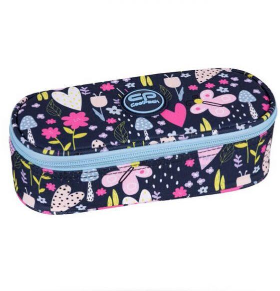 Cool Pack márkájú tolltartó nagyoknak. Az ovális formájú cipzáras tolltartó közepén van egy klapni, melynek mindkét oldalán 5-5 gumipánt található ceruzáknak, tollaknak. Az egyterű részébe bedobálhatóak az írószerek, kiegészítők. A lányos tolltartó üres, a képen látható eszközök illusztrációk. Mérete: 23x5x9 cm. Szín: kék, rózsaszín virágos - pillangós -