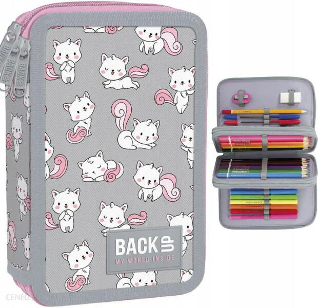 A BackUp Cicás felszerelt 3 emeletes tolltartó - Táncoló cicák (PB6EW26) teljes felszereltséggel kapható. A cuki cica mintával egyszerű és figyelemfelkeltő hatást nyújt, különlegesen kiemelik egyediségét a lila kiegészítők. Az iskolás fiúknak és lányoknak készült különleges tolltartó tartalma: 1 db golyóstoll, 1 db grafit ceruza, radír, hegyező, vonalzó, 9 db háro