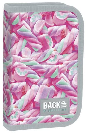 A BackUp felszerelt kihajtható tolltartó - Marshmallows teljes felszereltséggel kapható. A két oldalra kihajtható fül rejti a 10 db színes ceruzát, 7 db filctollat, 1 db golyóstollat, 1 db grafit ceruzát, radírt, vonalzót és hegyezőt. A kihajtható tolltartót színes mályvacukor mintázat díszíti.