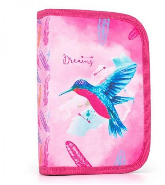 Szép kolibri madaras mintájú tolltartó 2 kihajtható füllel kislányoknak, melyben kényelmesen elférnek az írószerek az alsó tagozatban. Órarendnek is van hely benne. Lányos tolltartó mérete: 21x4,5x14 cm. Szín: rózsaszín. Kialakítása: két kihajtható klapnival rendelkezik, melyen kívül órarend és szorzótábla található. Kialakítása: 7+9+9 gumipánt ceruzáknak, 1-1 sz