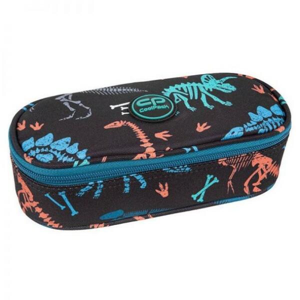 Cool Pack márkájú tolltartó nagyoknak díno fosil mintával. Az ovális formájú cipzáras tolltartó közepén van egy klapni, melynek mindkét oldalán 5-5 gumipánt található ceruzáknak, tollaknak. Az egyterű részébe bedobálhatóak az írószerek, kiegészítők. A fiús tolltartó üres, a képen látható eszközök illusztrációk. Mérete: 23x5x9 cm. Szín: fekete, kék és nara