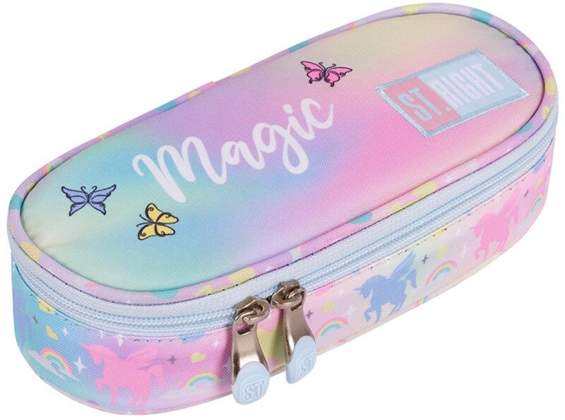 St. Right Magic Unicorn ovális tolltartó PC01 23x9,5x6cm Hivatalos magyarországi forgalmazótól. Leírás: A St. Right Magic Unicorn ovális tolltartó (PC01) megjelenése varázslatos és mesés. Az előlapot és az oldalakat csodaszép unikornisok, szivárványok és csillagok díszítik, amelyek élénk színekben pompáznak a rózsaszín alapon. Ezek a mesés motívumok garantáltan elvar