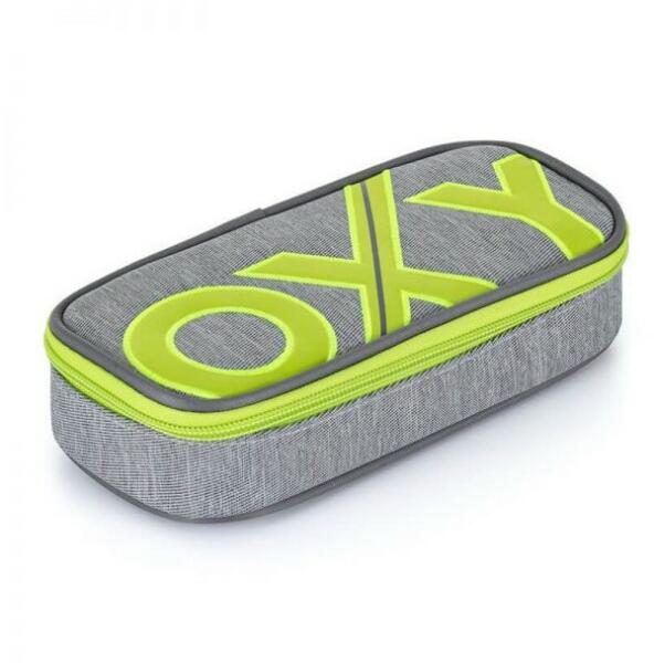 Oxy Bag márkájú szögletes cipzáras tolltartó belső cipzáras és nyitott zsebbel, középen füllel, melynek mindkét oldalán gumipántok találhatóak Oxy felirattal. A mélyített belső részbe ömleszthetőek az írószerek. Remek választás kamaszoknak, lánynak, fiúnak egyaránt. Mérete: 20,5x5x10 cm. Anyag: poliészter. Szín: szürke/neon zöld.