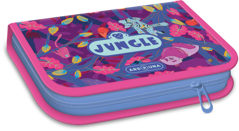 TOLLTARTÓ, FELTÖLTÖTT, ARS UNA JUNGLE (5259) 23 Írószerekkel töltött cipzáros tolltartó két kihajtható füllel, gumis kialakítással az írószerek tárolásához. Tartalma: 12 db színes ceruza, 3 db HB grafit ceruza, 1 vékony és 1 vastag postairón, 8 db színes filctoll, 1 db radír, 1 db hegyező, 1 db 17 cm-es egyenes vonalzó, 1 db háromszög vonalzó, órarend A és B hétre.