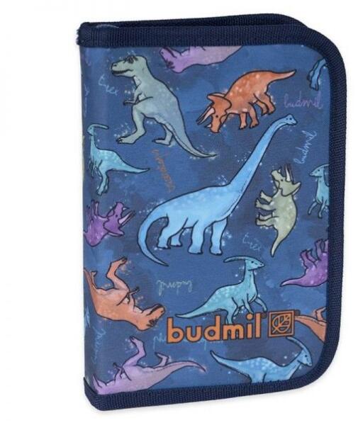 Budmil márkájú kihajthatós tolltartó alsósoknak. A tolltartó egy kihajtható klapnival rendelkezik, melyen órarendtartó is található. Összesen 28 gumipánt található benne írószereknek, valamint 1-1 gumipánt hegyezőnek és radírnak. Anyaga: vízlepergető poliészter. Fiús tolltartó mérete: 20x13,5 cm. Színe: kék, színes dinós mintával. Hátoldalán Budmil márka címké