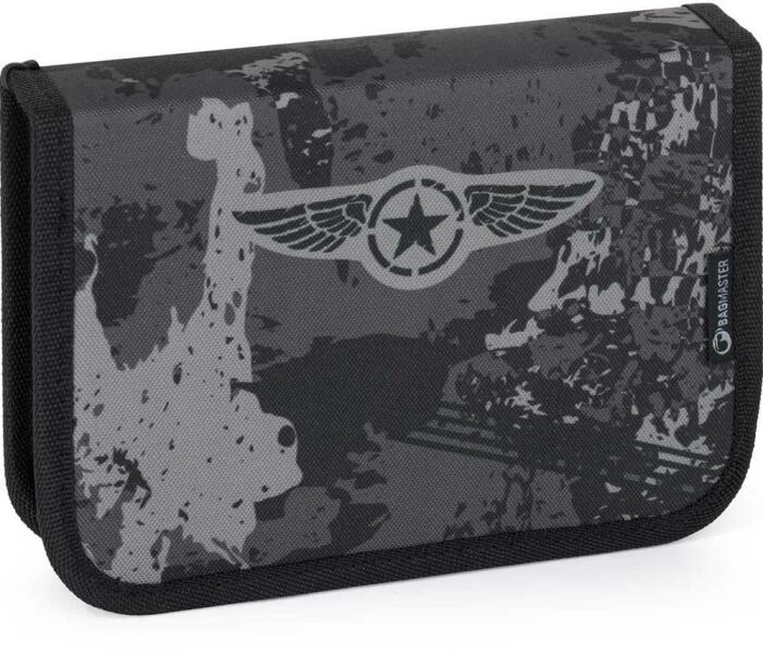 Fiús tolltartó, üres, két kihajtható, gumis kialakítású füllel az írószerek, vonalzók és radír tárolásához. Belseje mintás anyaggal borított. Átlátszó fólia alatt van egy órarend. Méret: 20,5 x 13,5 x 4 cm Gyártó: Bagmaster