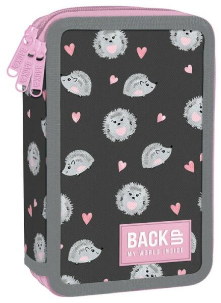 Kedves süni figurák és szívecskék dekorálják a praktikus tolltartót. A rózsaszín cipzárak és a nagyméretű BackUP felirat táblája kiemelkedik a tolltartó sötét alapszínéből. A háromrekeszes, cipzáras tolltartót kombinálhatod a modellhez tartozó iskolatáskával vagy tornazsákkal. Tágas, funkcionális és felszerelt tolltartó, kiváló minőségű, vízálló anyagból