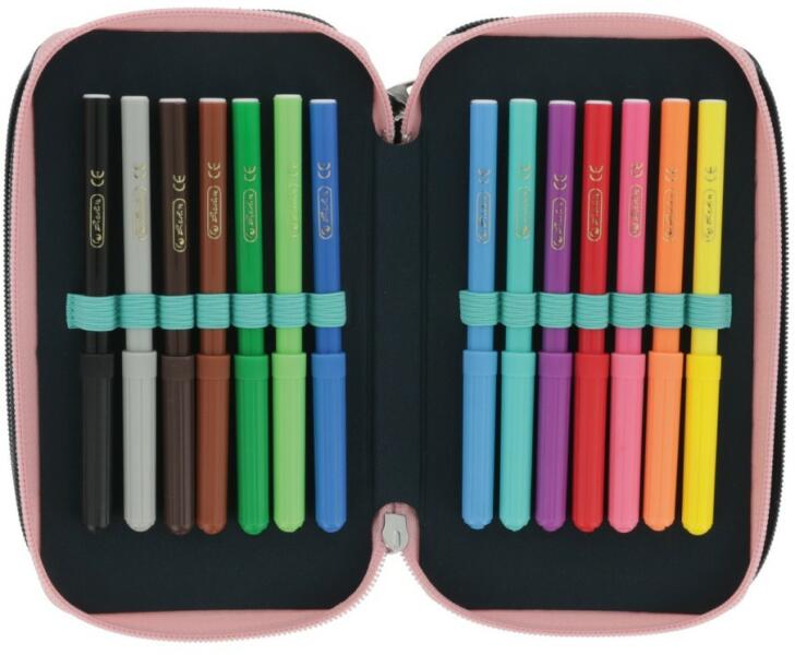 Herlitz Tolltartó 3 emeletes 31 részes Fancy Peacock 50043392 3 emeletes tolltartó. 3 cipzárral ellátott. Töltött kivitelben. Mérete: 19x11,5x7 cm. Színben harmonizáló belsővel. Tartalma: 14 db filctoll, 1 db golyóstoll, 1 db radír, 1 db ceruzahegyező, 2 db grafitceruza, 8 db színesceruza, 1 db egyenes vonalzó, 2 db háromszög vonalzó, 1 db sablon vonalzó. Anyaga: poliészter.