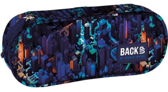 BackUp Geometrikus ovális tolltartó - Felhőkarcolók mintáján a felhőkarcolók láthatók amint a halvány fény megvilágítja őket. Egyterű belsejében praktikus felhajtható fül is található, melynek egyik oldalán kis cipzáras zseb van, másikon gumifülek tollnak, ceruzának. Az összes írószer elfér benne, amire az iskolában szükséged lehet.