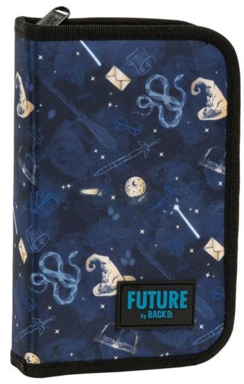 A Future by BackUp felszerelt kihajtható tolltartó - Magic teljes felszereltséggel kapható. A két, oldalra kihajtható fül rejti a 10 db mintás színes ceruzát, 7 db filctollat, 1 db golyóstollat, radírt, vonalzót és hegyezőt. A tolltartóban találsz még órarendet és szorzótáblát is. A kék alapszínű tolltartót mágikus mintázatok díszítik.
