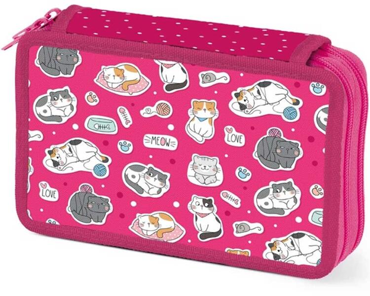 Emeletes tolltartó macskás motívummal, üres. 24 hurkot tartalmaz az írószerekhez és 3 nagyobb hurkot, például vonalzóhoz, hegyezőhöz, radírhoz vagy olló. A nagy cipzárnak köszönhetően nagyon könnyen záródik, kiváló minőségű és tartós anyagokból készült. Gyártó: MFP