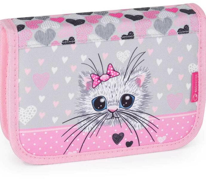 Egyszintes nem tölltöt cicás tolltartókét kihajtható füllel lányok számára. A tolltartó belül rózsaszín béléssel rendelkezik, minőségi fém húzózsinórral ellátott cipzárral van ellátva, nagyszámú gumi fogantyúval rendelkezik az iskolaszerekhez. A tolltartó anyaga megfelel az EU / EN szabványoknak biztonsági szempontból. . Méret: 20,5 x 13,5 x 4 cm Gyártó: Bagmaste