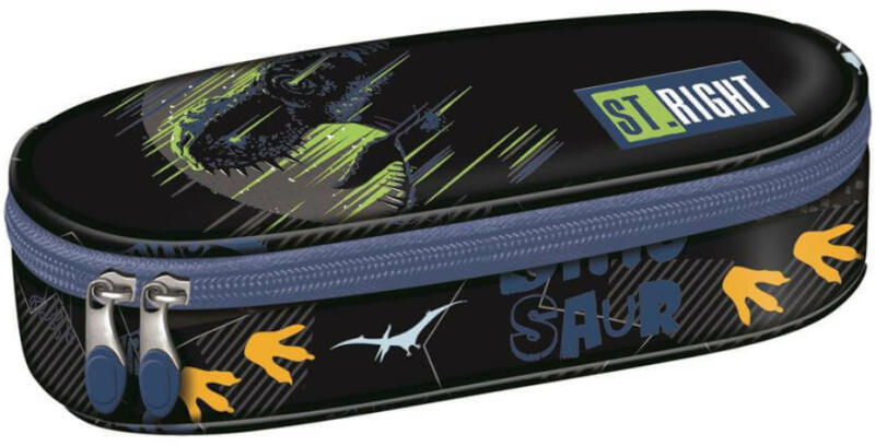 St. Right - Dinoszauruszos ovális tolltartó (667640) belseje egyterű, praktikus cipzáras zseb is található benne, így elfér a tolltartóban az összes írószer, amire az iskolásoknak szüksége van. Ez a menő dinoszauruszokkal díszített tolltartó az iskolatáskák trendi kiegészítője lehet.