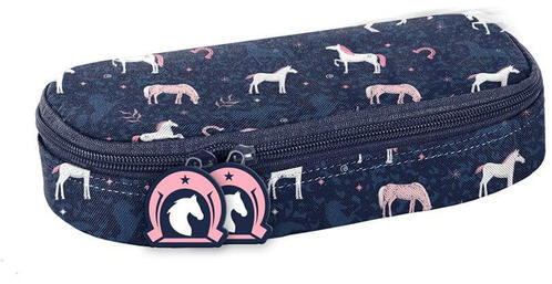 Lovas ovális tolltartó - sötétkék (PP24HR-013) belseje egyterű, praktikus cipzáras zseb is található benne, így elfér a tolltartóban az összes írószer, amire az iskolásoknak szüksége van. Aranyos, lovas mintájával az iskolatáskák trendi kiegészítője.