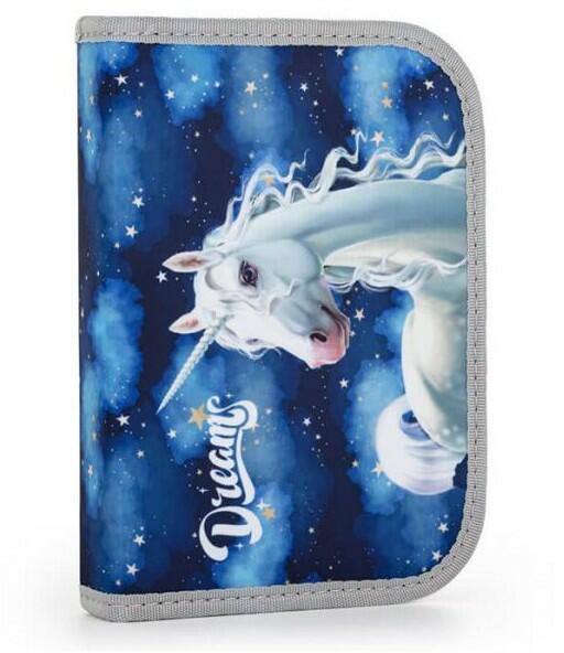 Szép egyszarvú unikornisos üres tolltartó 2 kihajtható füllel, melyben kényelmesen elférnek az írószerek. Órarendnek is van hely benne. Lányos tolltartó mérete: 21x4,5x14 cm. Szín: sötétkék. Kialakítása: két kihajtható klapnival rendelkezik, melyen kívül órarend és szorzótábla található. Kialakítása: 7+9+9 gumipánt ceruzáknak, 1-1 szélesebb gumipánt radírnak, h