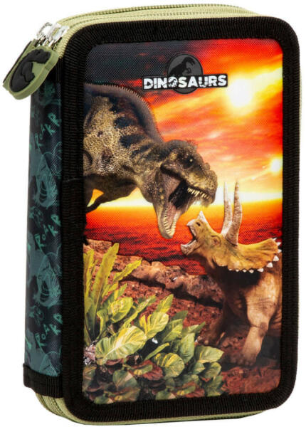 Gyermeked szereti a dinoszauruszokat? Akkor ez a dinoszaurusz tolltartó nagy siker lesz! A kétrekeszes, emeletes tolltartó mindkét fedőlapját színes dinoszauruszos dekoráció díszíti. Tolltartó fiúknak teljes felszereltséggel. Két külön cipzárral záródó rekesz. Letisztult, szilárd és merev szerkezet. A tolltartó tartalma: 2 db grafit ceruza, radír, hegyező, vonalzó, 10 db