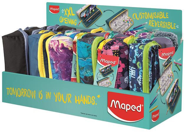 Tolltartó display, karton, asztali, MAPED "Open XXL", feltöltött ► 24db OPEN XXL: tegyük egyedivé a tolltartónkat! Eredeti és stílusos háromszög alakú, XXL-es nyílással rendelkező Maped tolltartó, amely ideális, hogy pillanatok alatt megtaláld kedvenc írószereidet! - látványos kihelyezés: asztali karton display - 24 db háromszög alakú, kifordítható, személyre szabhat