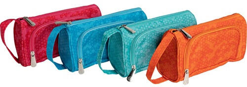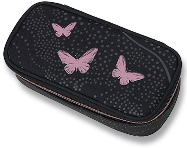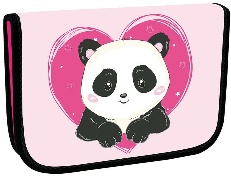 Kihajtható tolltartó alsós lányoknak 23 különböző méretű gumiszalaggal a nagyobb ceruzák vagy tollak, vonalzó, hegyező és radír kényelmes tárolásához. A két belső szárny átlátszó zsebbel rendelkezik a külső oladlán, az órarend vagy egyéb apró dokumentumok számára. Belső oldalán egy kis zseb található, amely patenttal zárható. A tolltartók cipzárainak húzó
