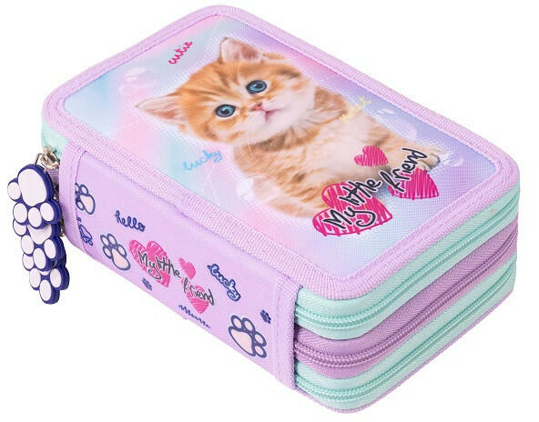A My little friend felszerelt 3 emeletes tolltartó - Pastel Kitty (668876) teljes felszereltséggel kapható. A tolltartó tartalma: 2 db grafit ceruza, 18 db színes ceruza, 9 db tűfilc, 9 db filctoll, radír, hegyező, vonalzó szett, körző, órarend, 1 db kék és 1 db fekete golyóstoll. A tolltartó egy cuki cica látható, a cipzárak húzókája tappancs formájú. Ajánlott korosztály
